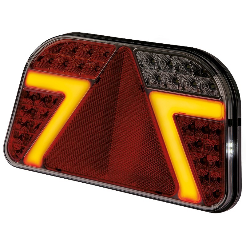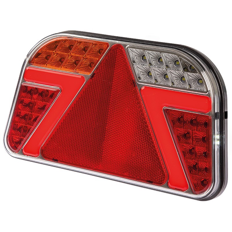 Släpvagnsbelysning med triangulär reflektor och stöd för flera funktioner. Lampan är utrustad med bromsljus, parkeringsljus, dimljus, backljus, regplåtsljus och blinkers. Uppfyller kapslingsklass IP67 och godkänd för allmän väg. För montering på höger sida.