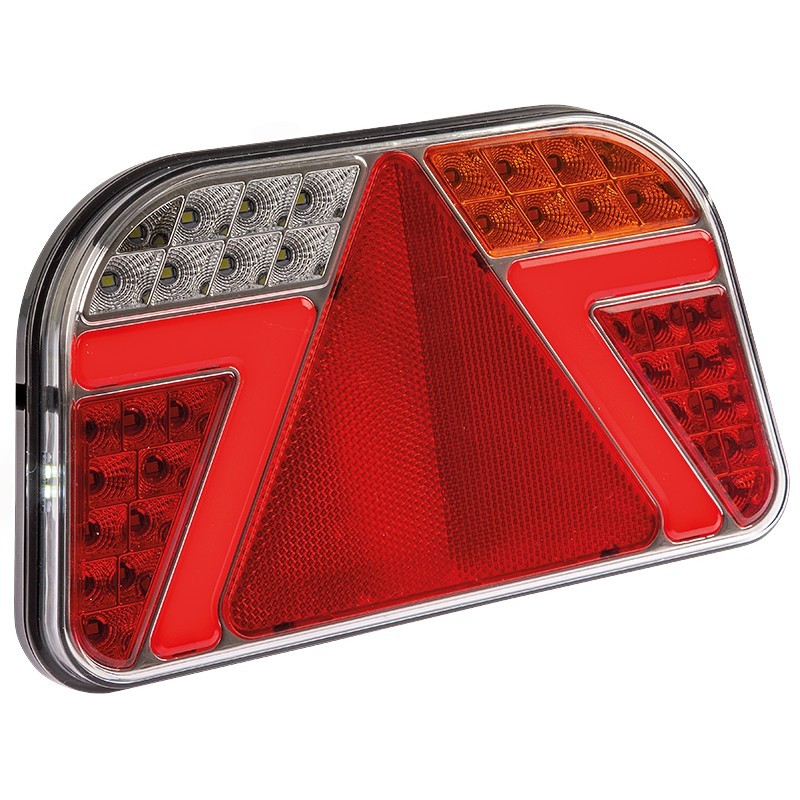Släpvagnsbelysning med triangulär reflektor och stöd för flera funktioner. Lampan är utrustad med bromsljus, parkeringsljus, dimljus, backljus, regplåtsljus och blinkers. Uppfyller kapslingsklass IP67 och godkänd för allmän väg. För montering på vänster sida.